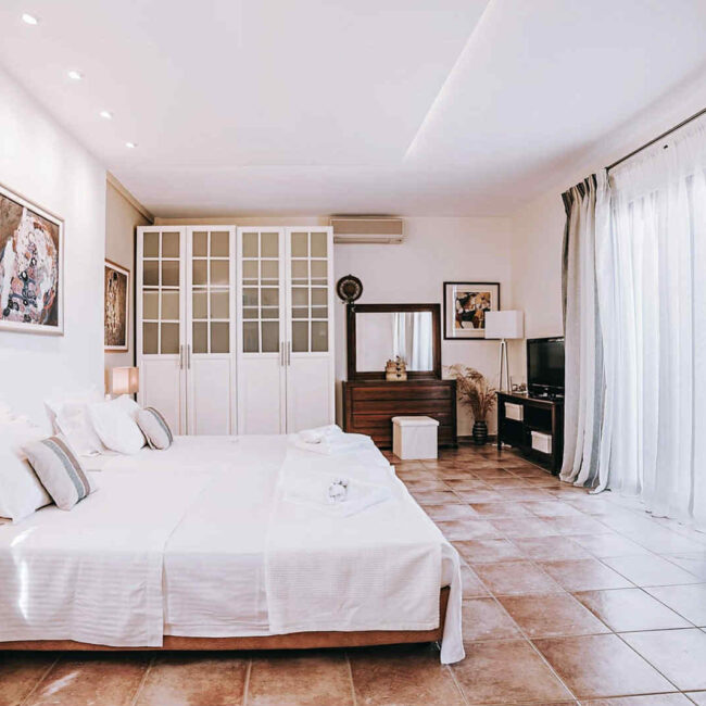 The master bedroom is on the second floor. A king size bed and down lights are the main “components” of this room. The master bedroom’s balcony has an unlimited view all the way out to the Ionian sea and the village of Nikiana.Garden & Pool