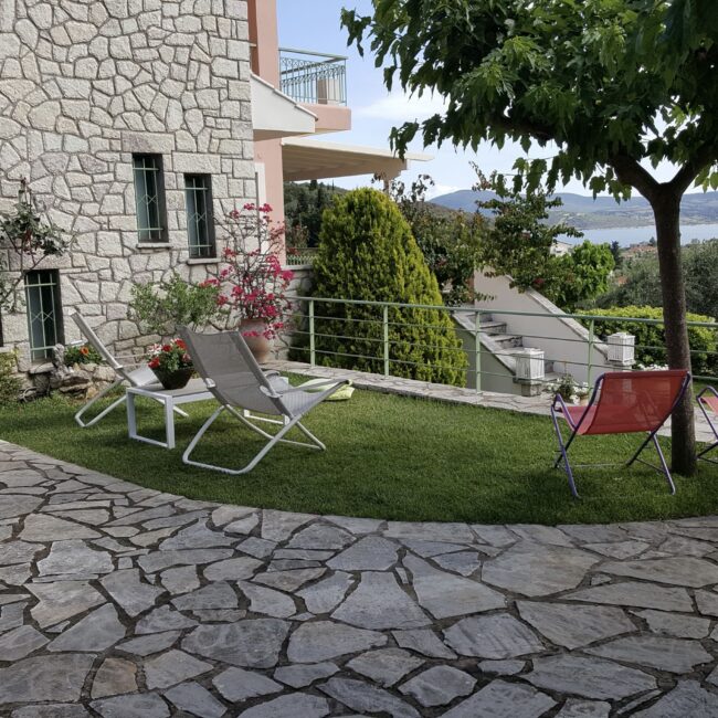The living room has a comfortable seating area with two sofas, a cable flat TV, a fireplace and a long balcony with amazing view that leads to the garden. The open plan kitchen is fully equipped and has everything you can need in your vacations in order to prepare your own meals (cooker, microwave, toaster, fridge and freezer, dishwasher, dishes, cooking utensils, etc) and drinks (juicer, coffee machine, liquidizer etc). It also has a very comfortable and spacious dining area with a big wooden table and chairs. The kitchen area is directly connected to the garden. On the first floor there are the two bedrooms. The first one has two semi-single very comfortable beds, a closet and a cute balcony with sea view. The second bedroom has a double bed and a crib (after request). It also has his own balcony with a sea view. On this floor there is also a spacious bathroom with a washing machine and a WC.2nd Floor